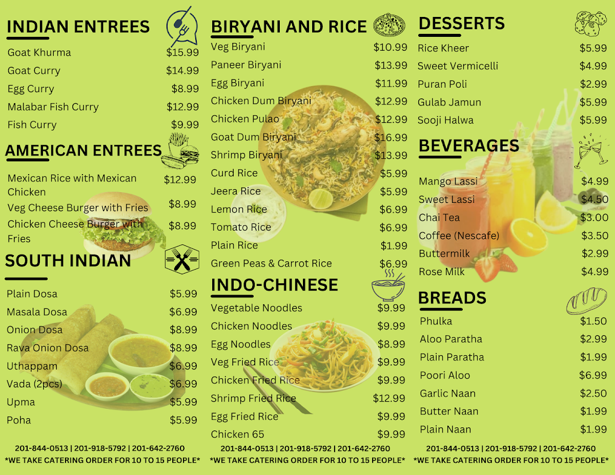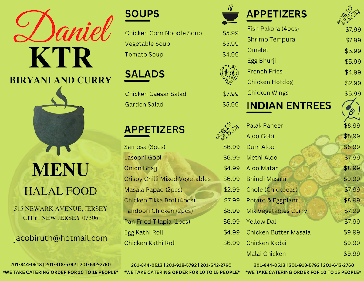 Daniel Ktr Biryani Curry offers a diverse menu that combines the best of Indian, South Indian, Indo-Chinese, and American cuisines. For starters, the Chicken Corn Noodle Soup and Vegetable Soup provide a light, flavorful beginning, while appetizers like Samosa (3pcs) and Onion Bhajji are perfect for those craving something crispy and savory. The Indian entrée section showcases a variety of dishes, including the rich Palak Paneer and comforting Aloo Gobi, with prices catering to different tastes. For those interested in South Indian fare, there are options like the classic Plain Dosa and Masala Dosa, as well as more unique variations like Rava Onion Dosa and Uthappam. The restaurant also offers a selection of Biryani dishes, with choices such as Veg Biryani, Chicken Biryani, and Goat Biryani. Indo-Chinese lovers will appreciate the Veg Fried Rice and Chicken Noodles, while American options include the Veg Cheese Burger with Fries and Chicken Cheese Burger with Fries. Desserts like Gulab Jamun and Sooji Halwa round off the meal on a sweet note, and beverages like Mango Lassi and Chai Tea complement the flavors perfectly. To accompany your meal, there are several bread options, including Garlic Naan and Aloo Paratha, offering a wonderful variety to suit every palate. With its broad range of dishes at reasonable prices, Daniel Ktr Biryani Curry is an ideal spot for those looking to enjoy a comforting, flavorful meal.